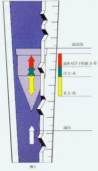 轉子流量計是一種變面積式流量計,它通常具有一段直立的錐管和一只可以在其中自由的隨流量大小上下移動的浮子(如圖1)。當流體自下而上流經錐管時,流體的動能在浮子上產生的推力S和流體的浮力A使浮子上升。隨著錐管內壁與浮子之間的環形流通面積增大,流體動能在浮子上產生的推力S隨之下降。當推力S與浮力之和等于浮子自身重力G時,浮子處于平衡,并穩定在某一高度上,該高度位置對應的刻度指示流過流量計的流量。