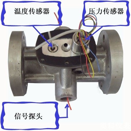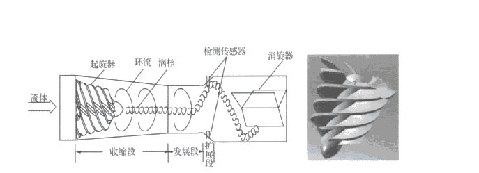 在流量計入口處裝有螺旋形導流葉片,流體進入后會產生激烈的螺旋旋轉,進入擴散腔后流體會發生二次旋轉,氣體旋轉后撞擊流量計內壁產生振動頻率,振動頻率是和流量成正比的。當流量計設計得當時,在很寬的流量范圍內,旋渦的頻率與流量成線性關系,該頻率由壓電傳感器檢測,由流量積算儀進行運算和處理,可以輸出4~20mA信號。