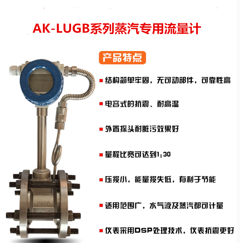 蒸汽流量計無可動部件,可靠性高,長期運行十分可靠。安裝簡單,維護(hù)十分方便。檢測傳感器不直接接觸被測介質(zhì),性能穩(wěn)定,壽命長。輸出是與流量成正比的脈沖信號,無零點漂移,精度高。測量范圍寬,量程比可達(dá)1:10。 壓力損失較小,運行費用低,更具節(jié)能意義。 在一定的雷諾數(shù)范圍內(nèi),輸出信號頻率不受流體物理性質(zhì)和組份變化的響,儀表系數(shù)僅與旋渦發(fā)生體的形狀和尺寸有關(guān),測量流體體積流量時無需補(bǔ)償,調(diào)換配件后一般無需重新標(biāo)定儀表系數(shù)。 應(yīng)用范圍廣,蒸汽、氣體、液體的流量均可測量。 檢定周期為二年。